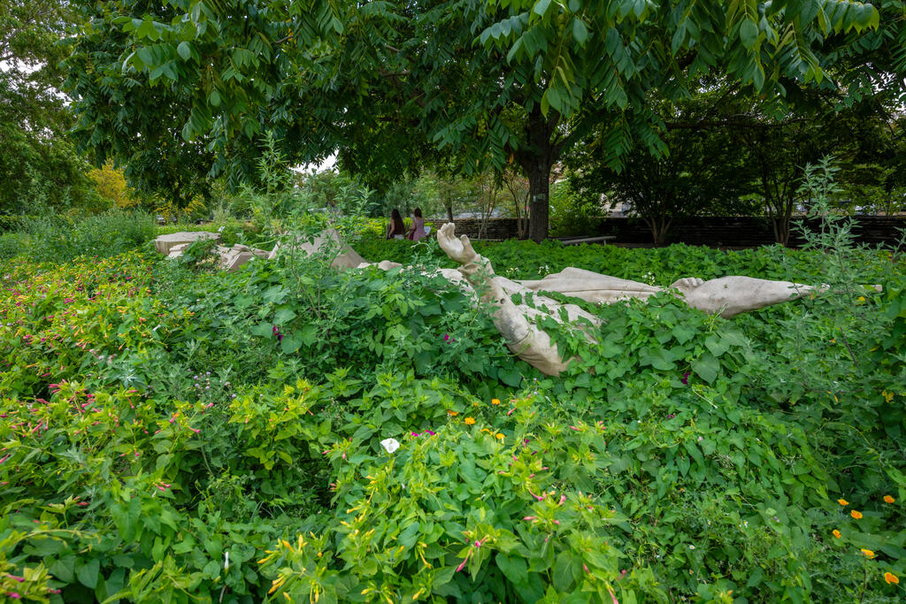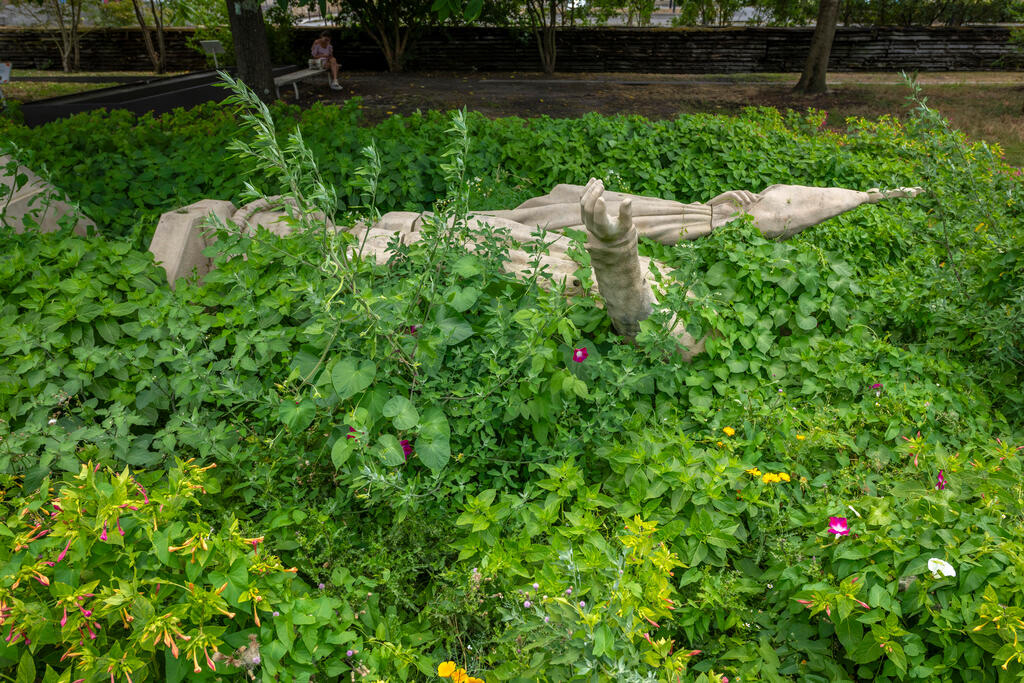 Descanso is an anti-monument that invites us to think about a paradigm shift. It is a replica of the statue of Christopher Columbus in Plaza Colón in Madrid, fallen and completely invaded by invasive weeds and plants (local and migrant) that gradually devour the figure in a colorful and harmonious feast.